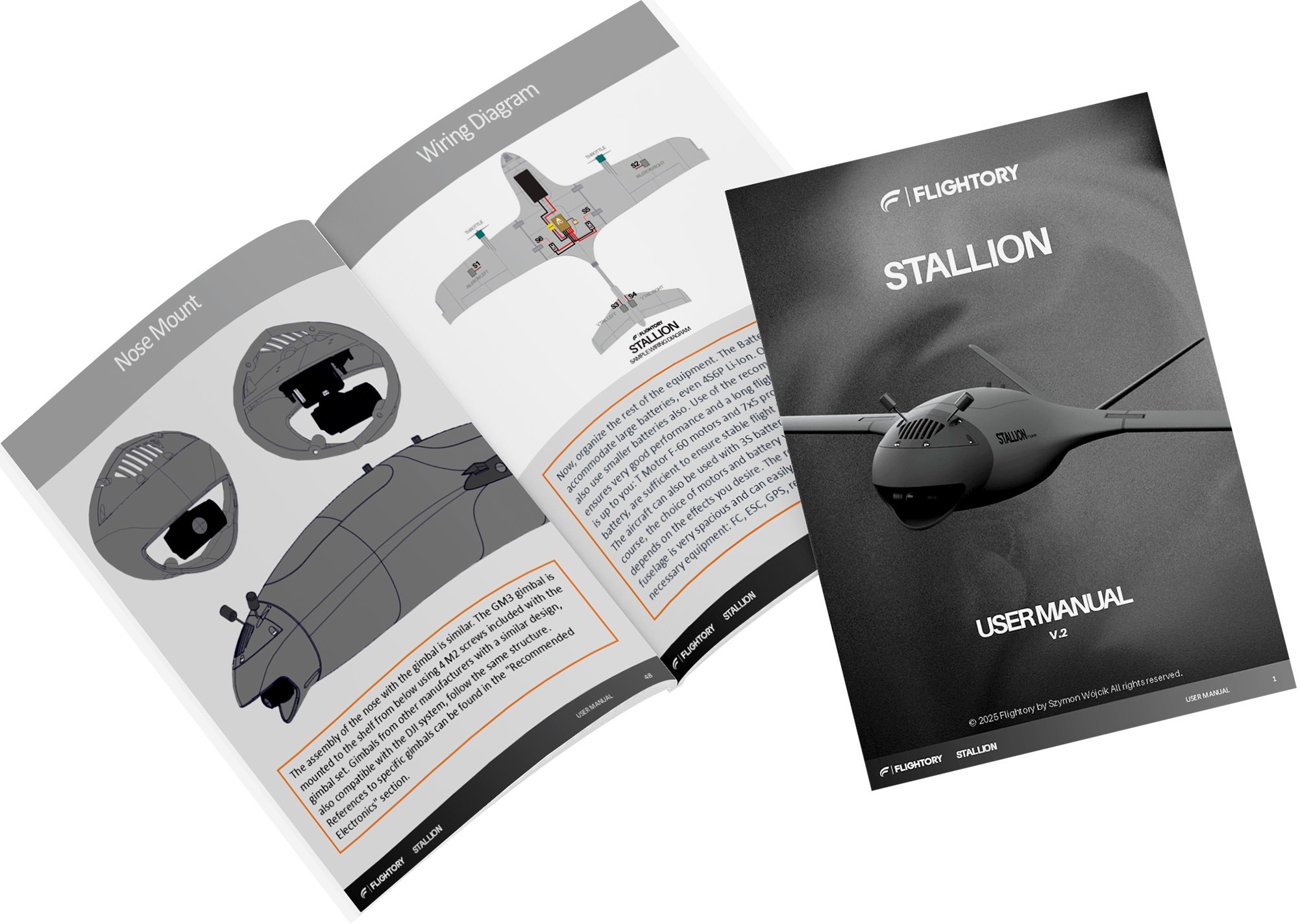 Stallion: 3D-printed fixed wing UAV, featuring two tractor motors, a single tail boom, and a V-tail , emphasizing optimal performance and compact design. Its geometry undergoes careful design and optimization using CFD and real test flights. The modular airframe includes a fully detachable nose for adapting to various payloads. The aircraft is designed for a standard 19x19mm FPV camera. All 3D printing files are provided in STL format, with some available in STEP for easy customization of components like mounts and sensors. With the recommended motors and battery, Stallion delivers excellent performance and low power consumption, achieving stable flight at under 40% throttle. Depending on the chosen equipment and battery size, it can be configured for long-range flights or as a lightweight aircraft for shorter distances. The Stallion offers a versatile, adaptable platform with a balance of performance and customization for various applications. All parts can be printed on a 220x220mm print bed.